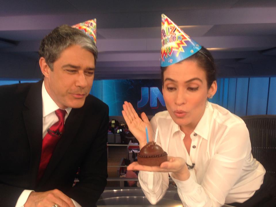 O Jornal Nacional fez ontem 46 anos de existência. O maior telejornal do Brasil aproxima-se dos 50 anos e se transformou nesse ano na versão mais informal de sua história, mais conversado, e menos 'oficial', entre as mudanças, os apresentadores agora se levantam da bancada tanto durante, quanto no fim das edições com a subida dos créditos. Confira a imagem do 'parabéns' no estúdio com Bonner e Renata: